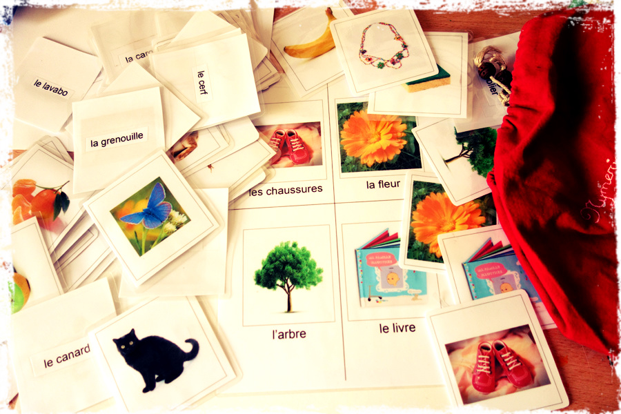 J'ai aussi découvert mes nouvelles grandes fiches qui abordent différents thèmes : objets du quotidien, animaux, fruits et légumes, moyens de transport, et même quelques verbes d'action. On les fait défiler simplement en regardant d'abord le mot, puis l'image, selon le même rituel que le petit loto photo.